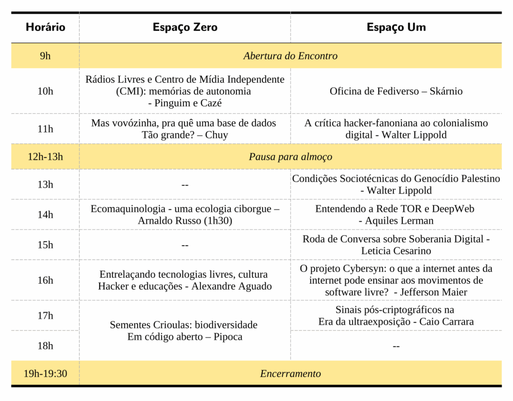 | 16h-17h | 0 | Entrelaçando tecnologias livres, cultura hacker e educações | Alexandre Aguado |